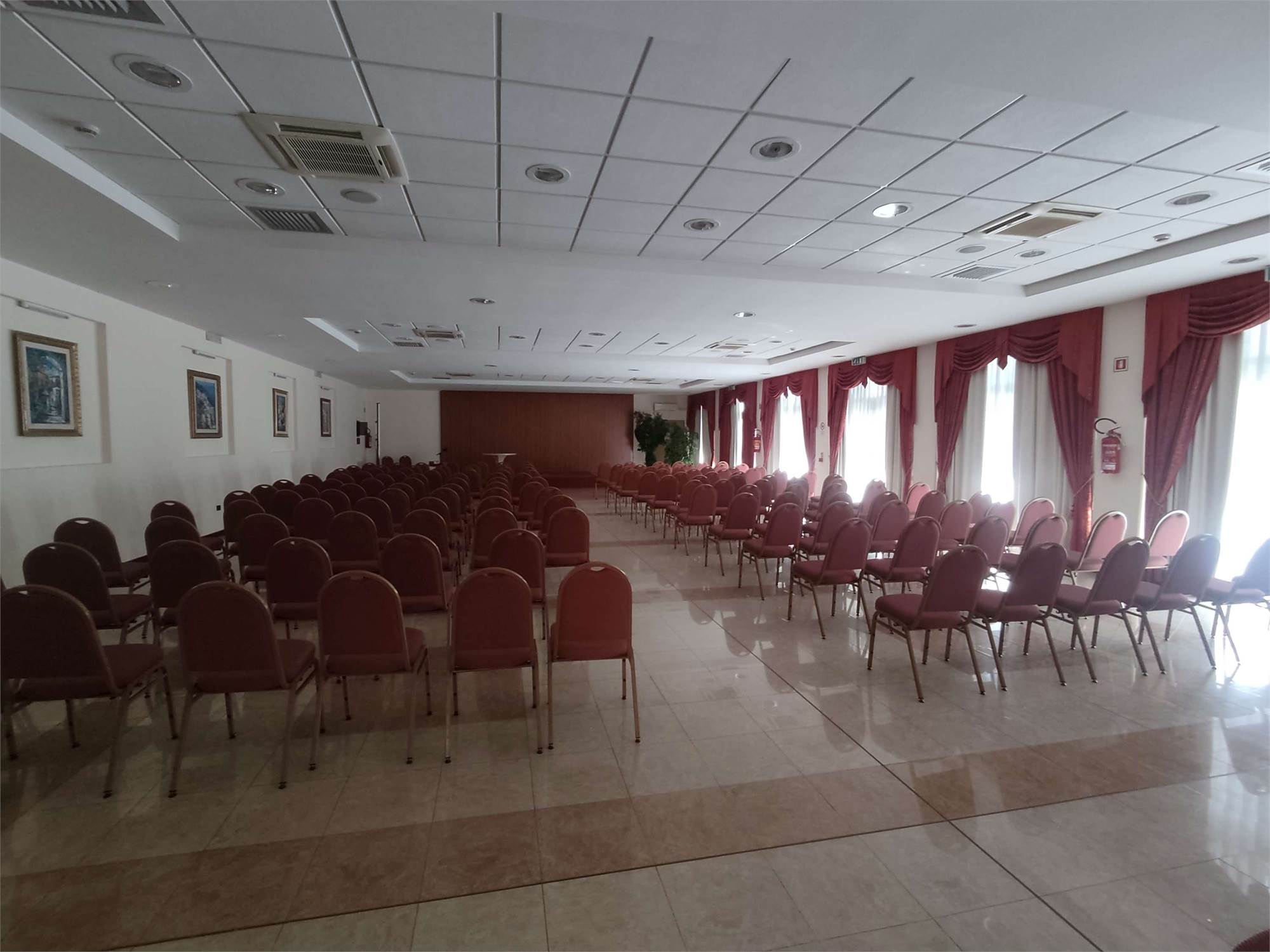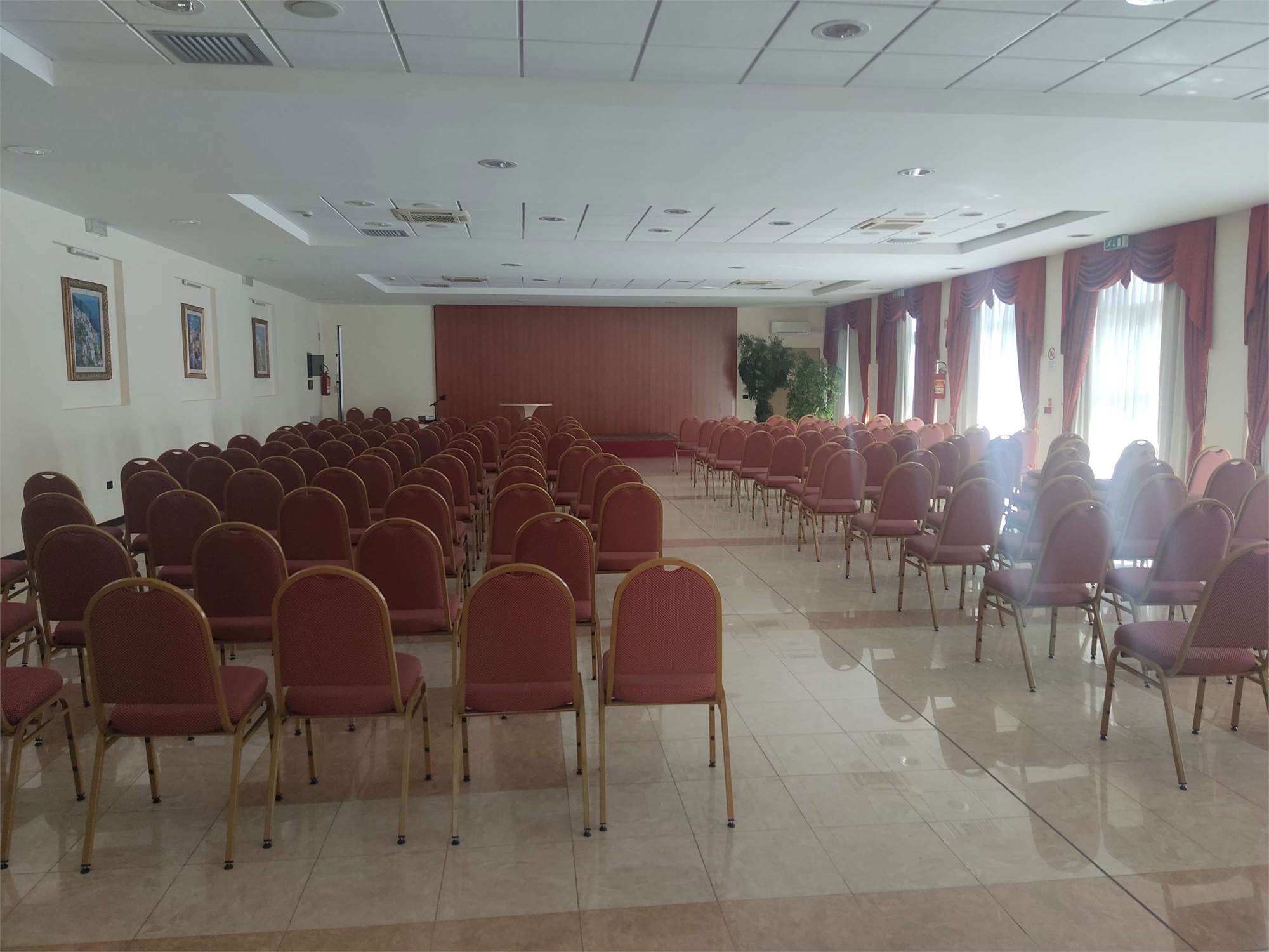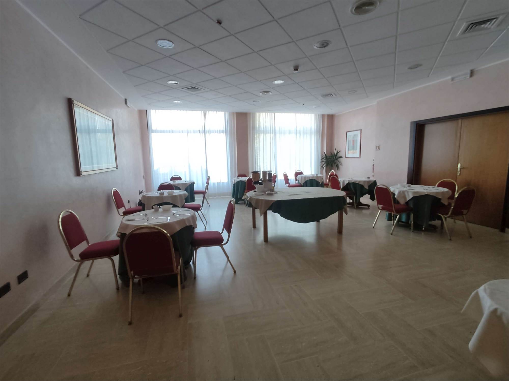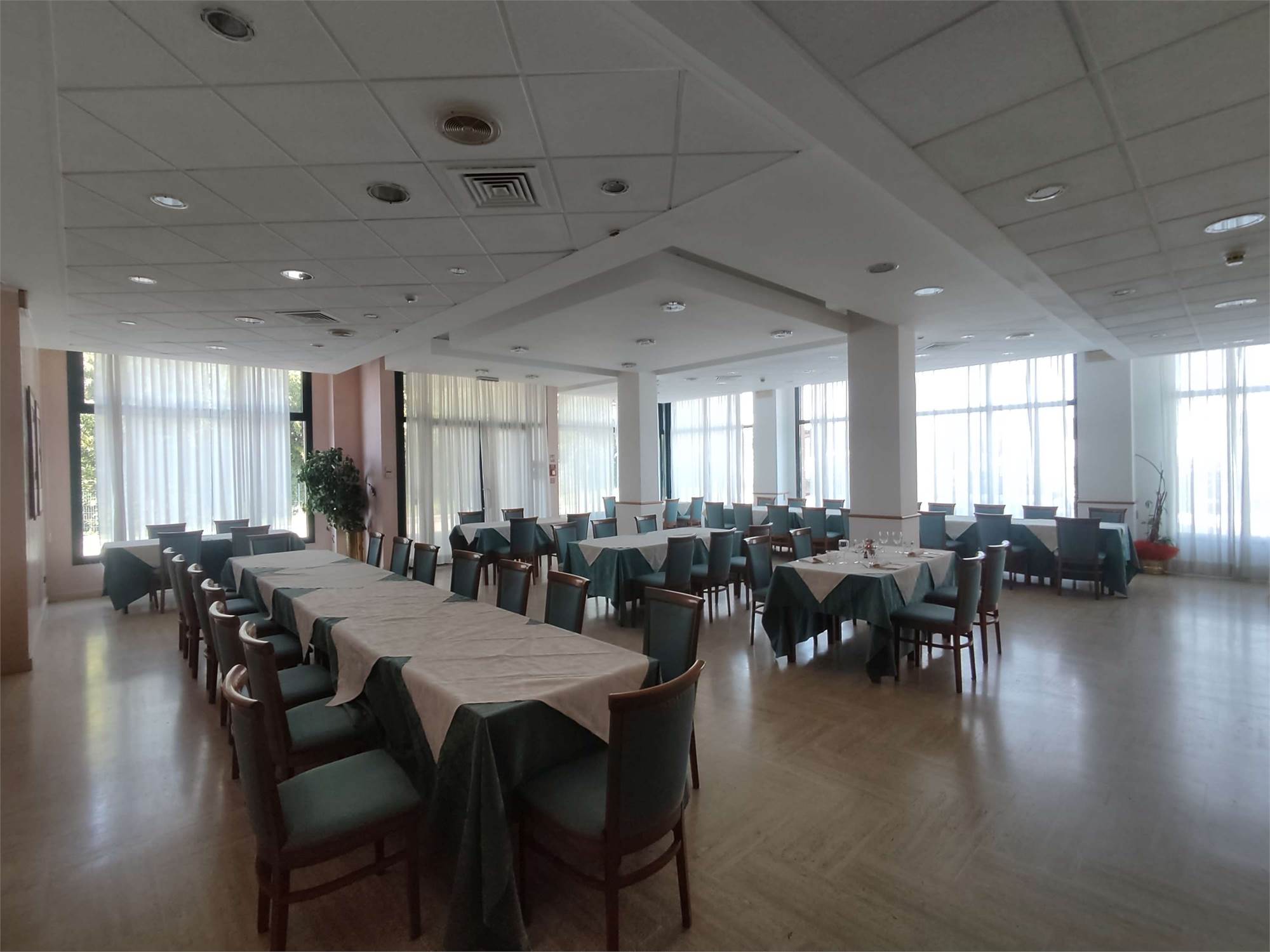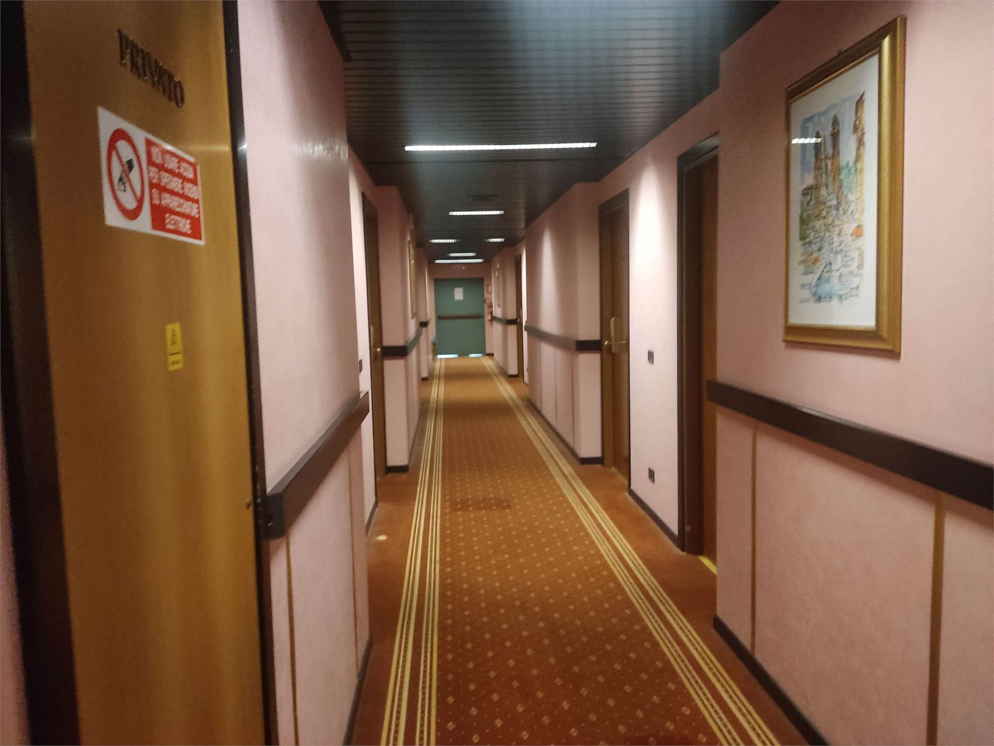 I due fabbricati sono accorpati fra loro, la struttura alberghiera ha una superficie di 3.866mq e si sviluppa su 4 piani diversi, internamente troviamo al piano interrato la centrale termica, più magazzini, una sala macchine, un ascensore, il locale in cui sono ubicati i contatori dell'energia elettrica, una centrale idrica e locali di deposito. Il piano terra contiene: una hall reception con ufficio, due sale riunioni, una zona ristorante, un bar, locali a servizio della gestione alberghiera (cucina con dispensa, ripostiglio con bagno, spogliatoi e servizi igienici), cinque camere idonee ad ospiti disabili dotate di bagno e terrazzo, ascensore e tre rampe di scale. Il primo, il secondo e il terzo piano hanno identica conformazione e ciascun piano contiene 24 camere (doppie oppure matrimoniali) con bagno (completo di doccia, lavabo, tazza wc e bidè), telefono, internet Wifi, televisore e frigo bar.