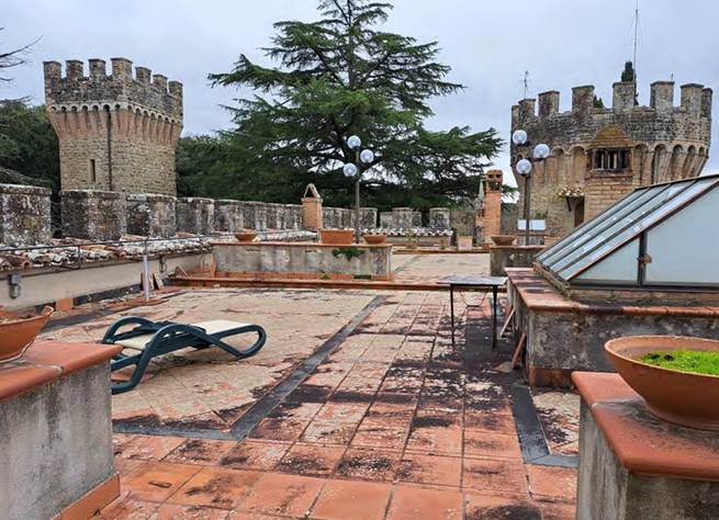 Castello situato a Perugia (PG), ad oggi utilizzato come struttura turistico - ricettiva composta dalle seguenti aree: la “SALA DEI DUELLI” utilizzata come sala per banchetti e cerimonie, la “CASA DEL GIARDINIERE” che è una abitazione privata e infine i TERRENI AGRICOLI per complessivi 169.970 mq che costituiscono in parte il parco privato del castello con alberature ad alto fusto ed in parte terreni agricoli da rimettere in coltura. A seguire una COUNTRY HOUSE (non in esercizio), articolata su quattro piani con una piscina di forma rettangolare.