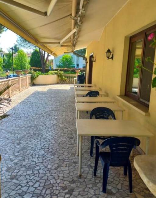 Pizzeria al piano terra di un complesso immobiliare sito ad Abano Terme (PD) in via G.B. Moroni, composta da bar, sale da pranzo, cucina con forno e servizi igienici, salita la scala si accede ad un ampio terrazzo.