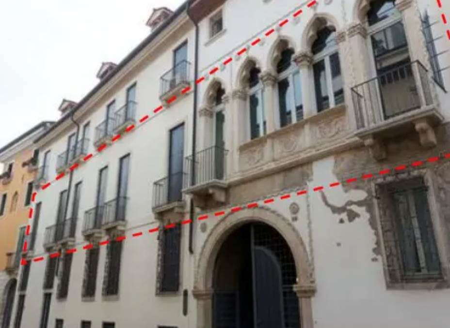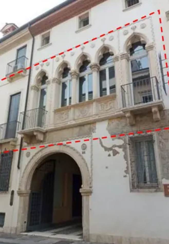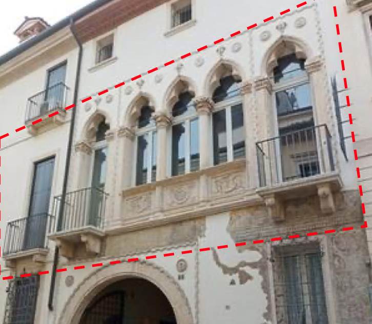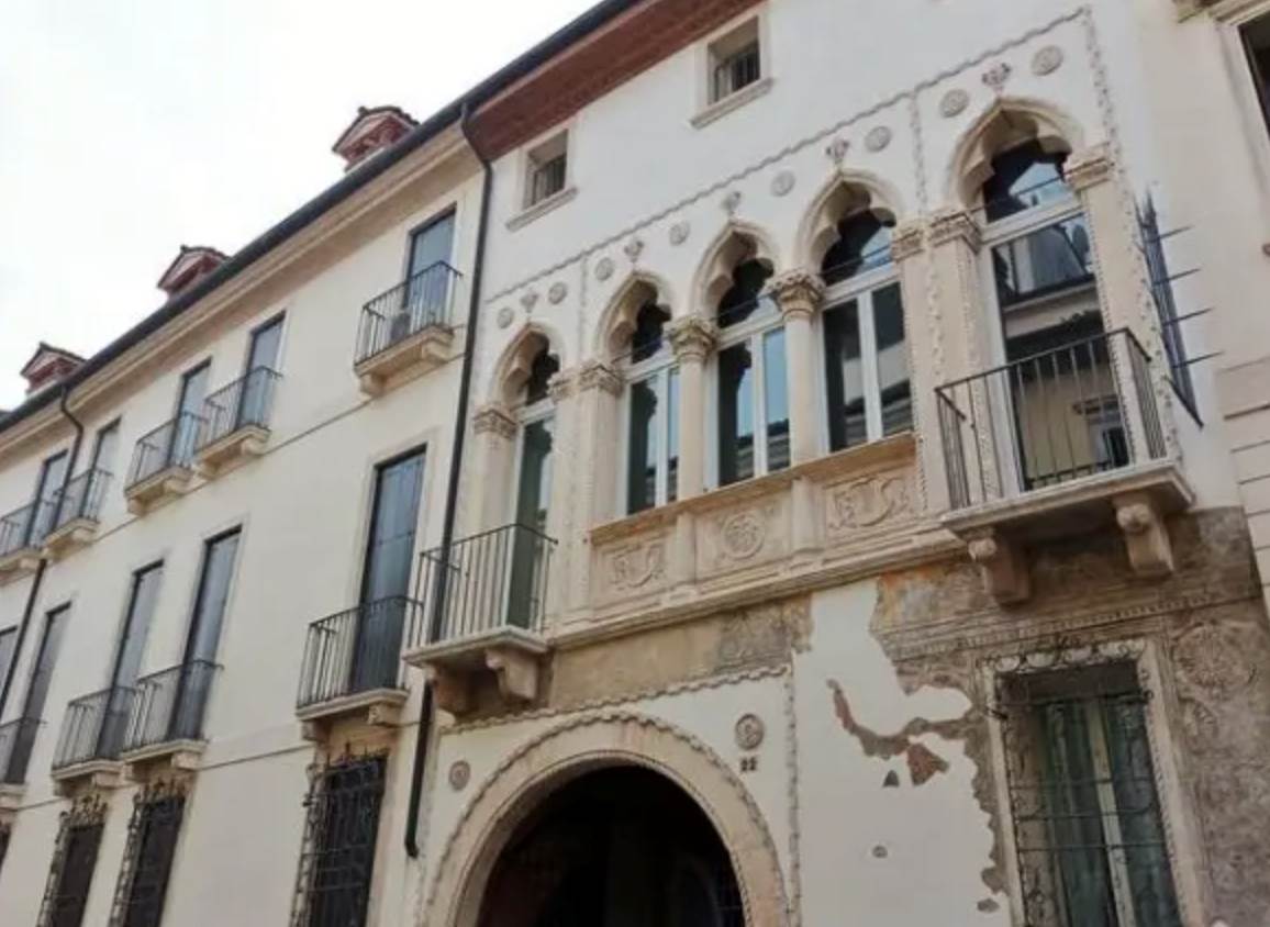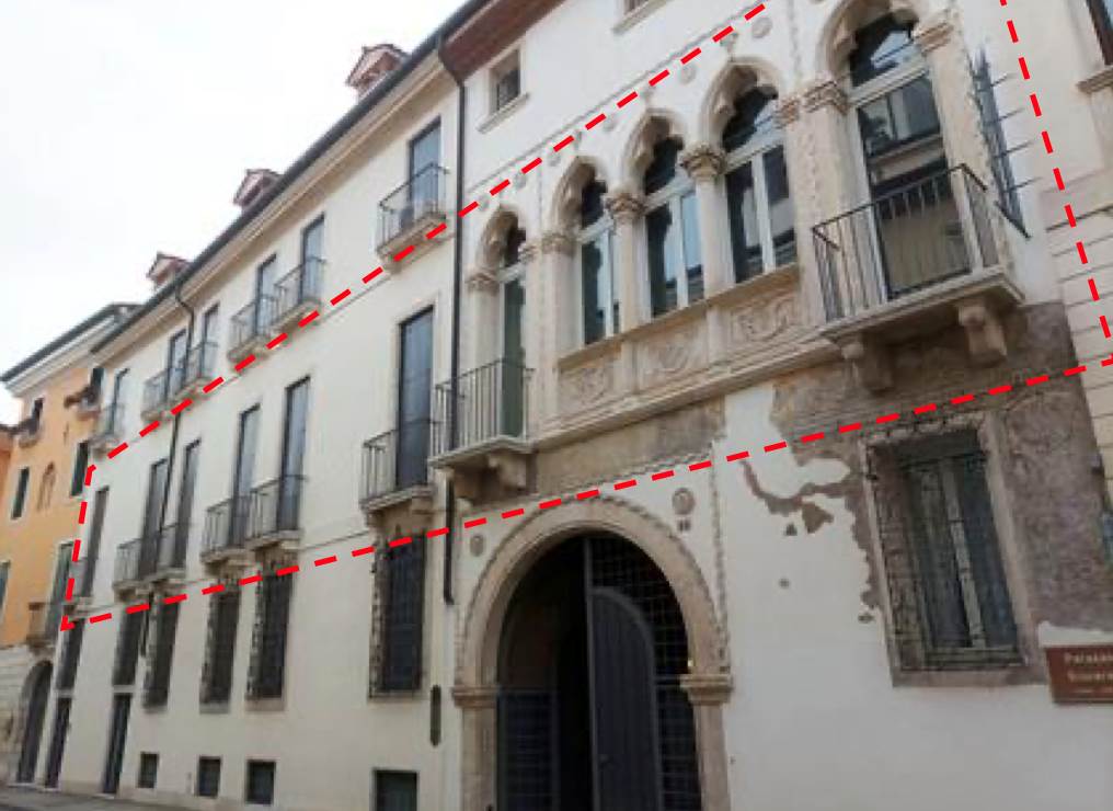 Abitazione signorile al piano primo con locale di deposito al piano interrato, posto auto scoperto al piano terra e locale autorimessa al piano terra in palazzo storico di origine quattrocentesca su tre piani fuori terra, noto come “Palazzo Squarzi” situato a Vicenza (VI) in contrà Santi Apostoli. L’appartamento è dotato di tre ingressi indipendenti; l’ampia scalinata è dotata di ascensore che collega tutti i piani del palazzo. L’abitazione risulta articolata da ingresso centrale, disimpegno-guardaroba, sala di soggiorno, sala da pranzo, cucina, disimpegno, lavanderia, due disimpegni, wc e sala sottoscala; ingresso lato sud, cucina, disimpegno, guardaroba, prima camera con bagno, seconda camera con bagno; ingresso lato nord, stanza affrescata utilizzata come camera, bagno, salone, n. 8 poggioli con affaccio sulla strada ed un ballatoio con affaccio sul cortile interno. Il deposito al piano interrato è costituito da un vano aerato con finestra a bocca di lupo, il posto auto scoperto è ubicato nel cortile comune interno del palazzo. L'autorimessa risulta adibita a magazzino-ripostiglio.