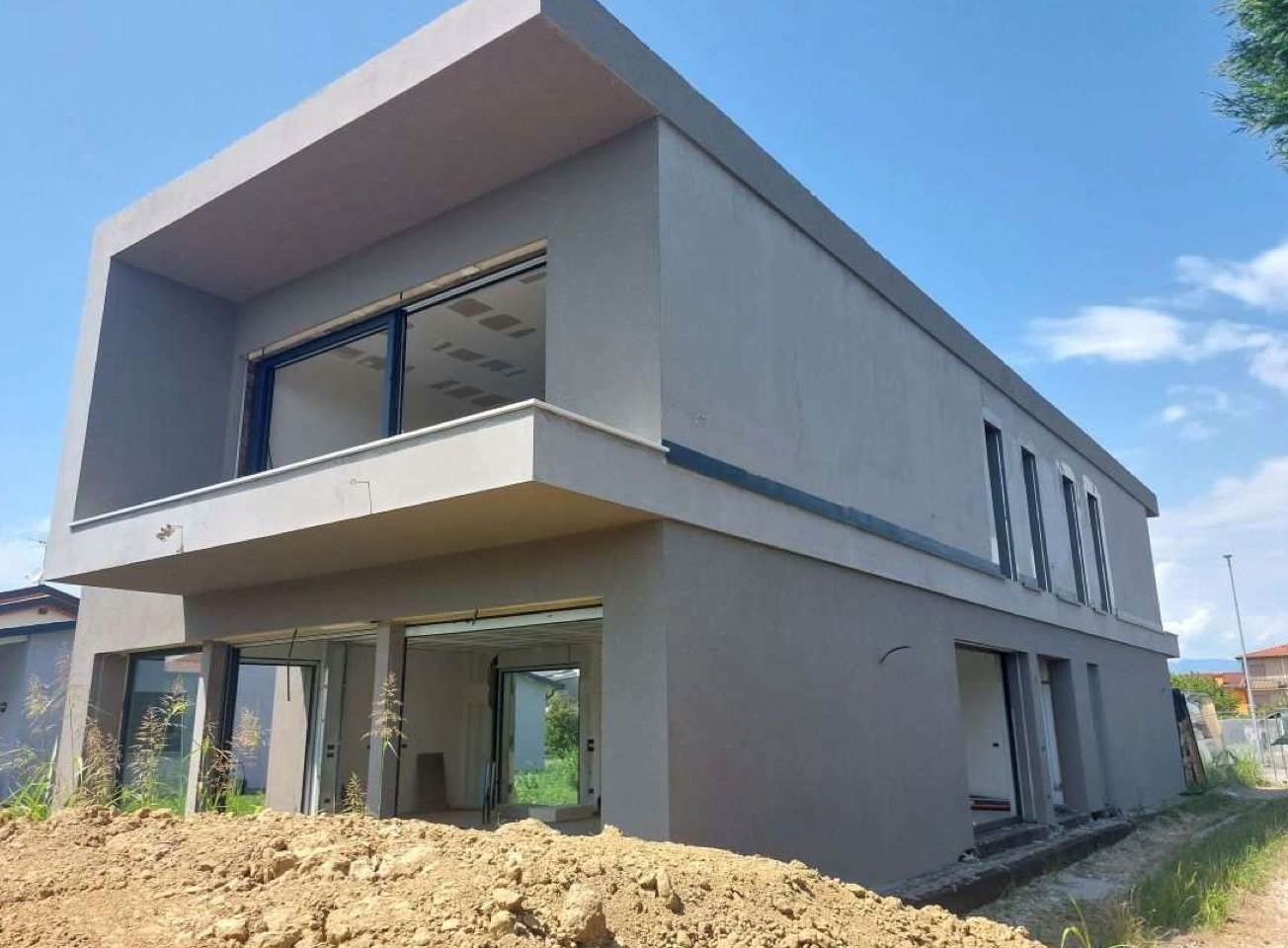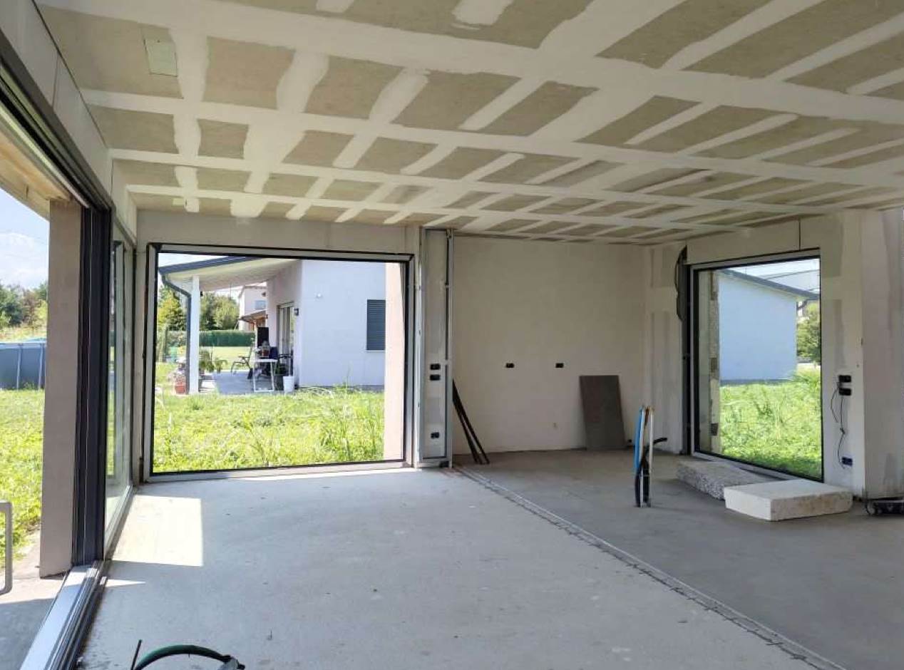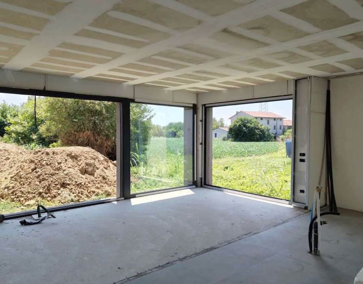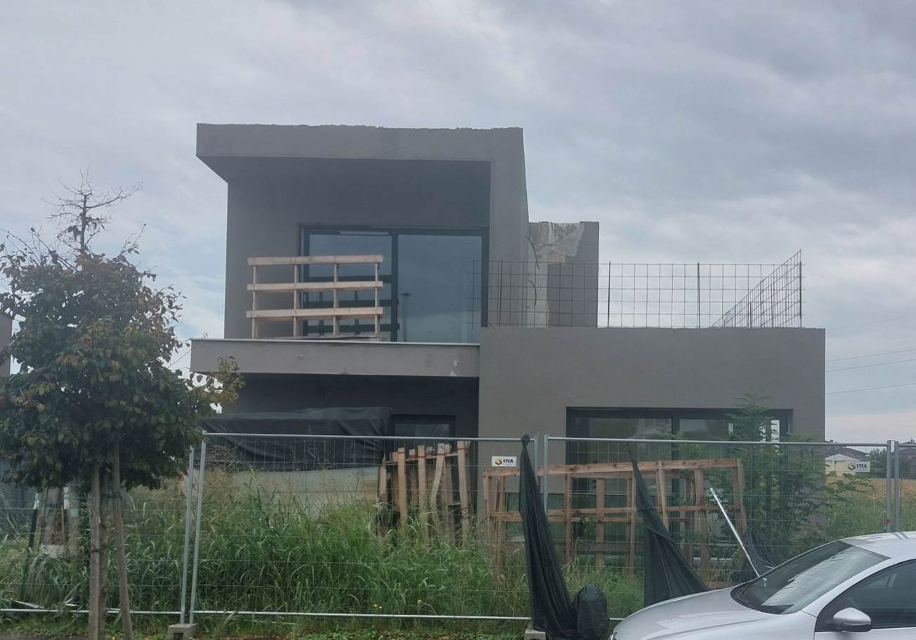 Edificio unifamiliare su due livelli, attualmente allo stato grezzo avanzato, con giardino di proprietà esclusiva situato a Monticello Conte Otto (VI) in via Girolamo Selmo. Al piano terra si trovano una ampia zona open-space ad uso soggiorno e cucina-pranzo, un disimpegno, un bagno, uno studio, una “stanza”, il locale ad uso centrale termica ed il garage; al piano primo con il collegamento interno da realizzarsi con scala ad una rampa, si trovano tre camere da letto, due bagni e due terrazze.