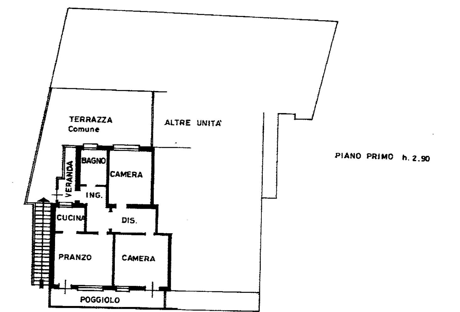 ingresso da scala aperta che conduce a poggiolo - terrazzo al piano primo comuni ad altra unità; l’alloggio si compone di veranda d’ingresso, ingresso - disimpegno, un bagno, cucina - sala da pranzo, due camere da letto e poggiolo.